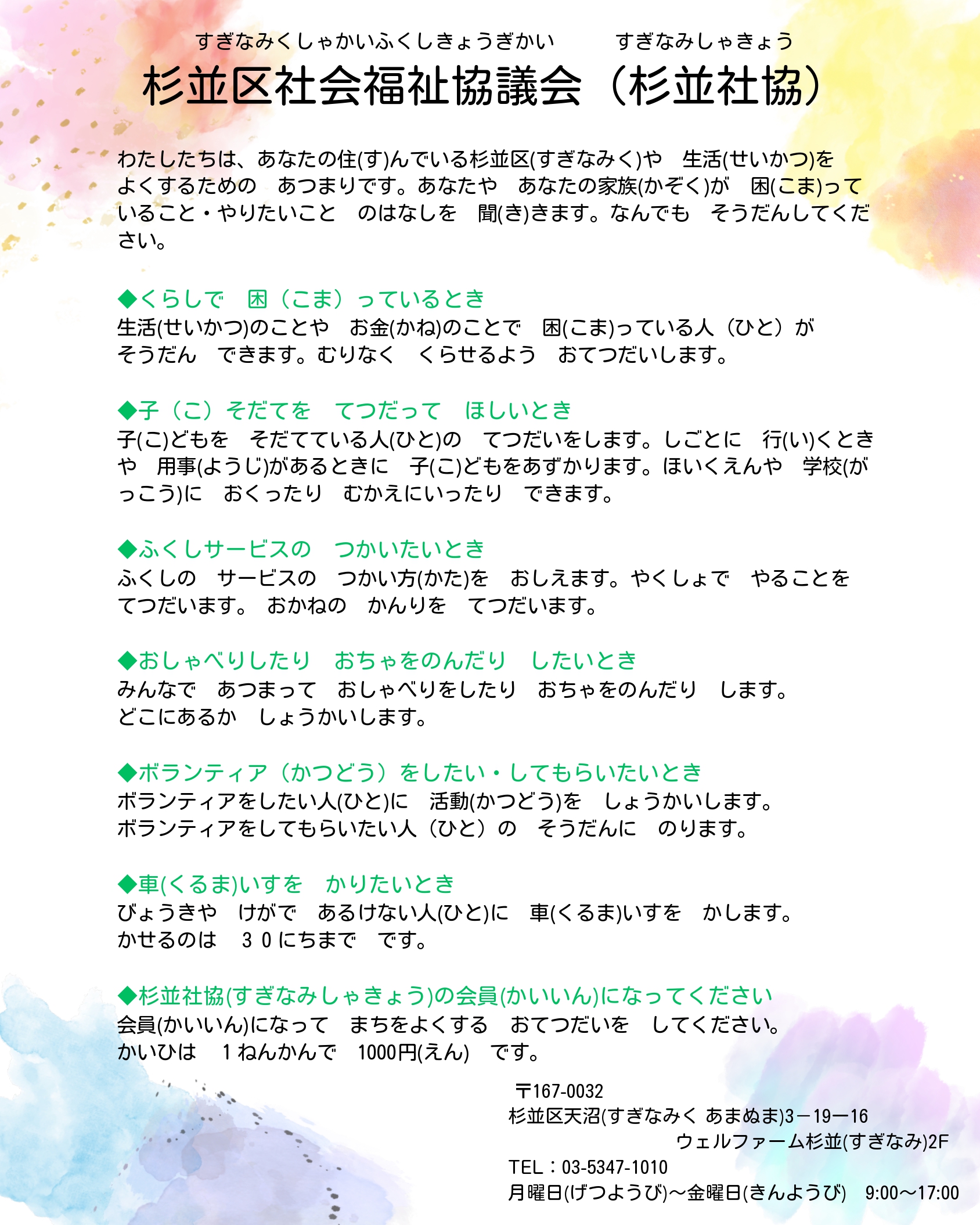 だれでも 読(よ)みやすい やさしい にほんご で杉並社協(すぎなみしゃきょう)の あんないを まとめました。