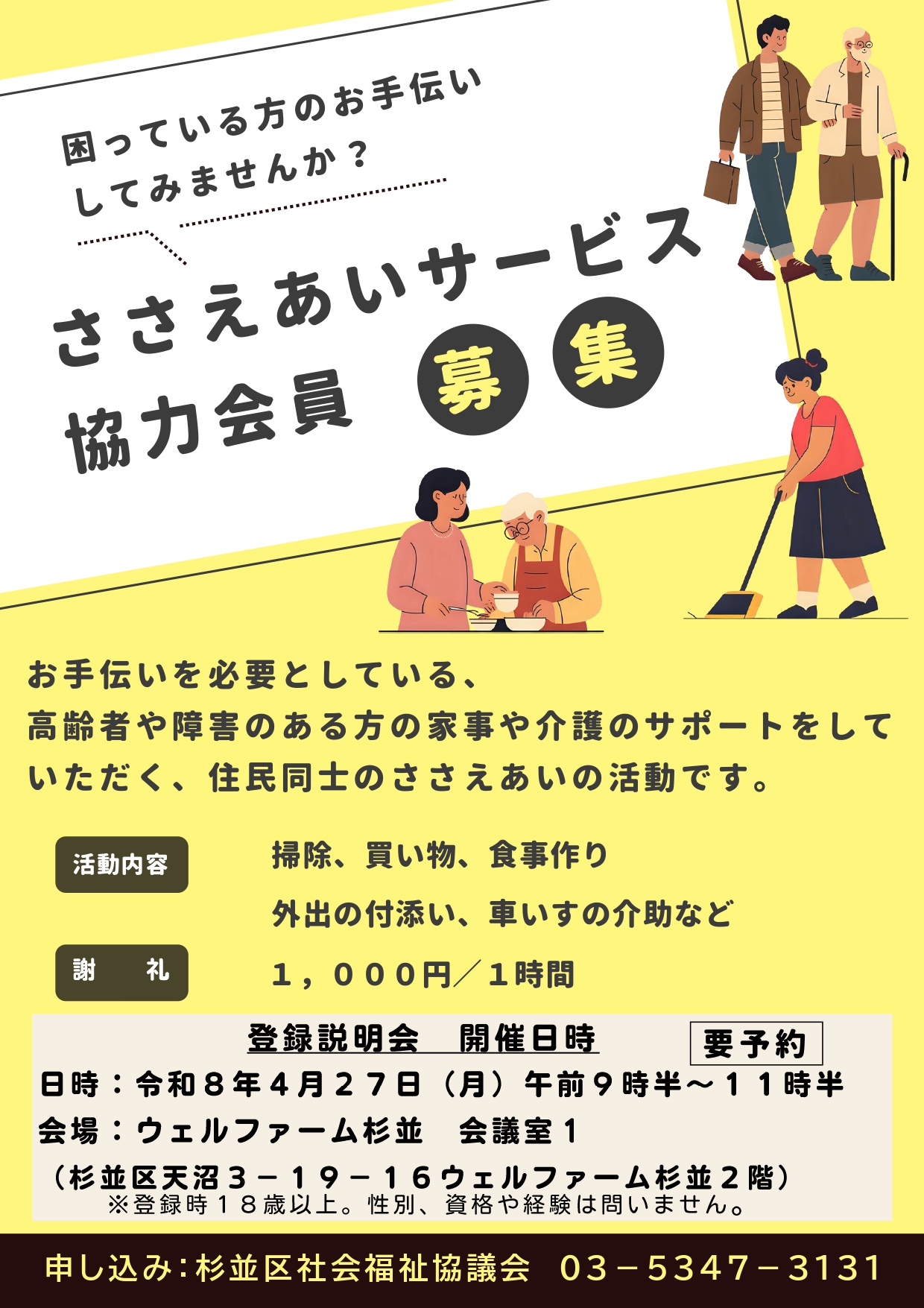 ささえあいサービスは、地域の方に協力会員になっていただき、高齢者や障害のある方の家事や介護のサポート行う、住民同士のささえあいの活動です。